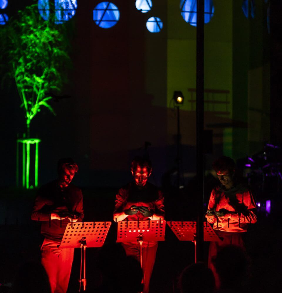 Cathy Van Eck Wings, for big white shields, three microphones, one loudspeaker and three performers
