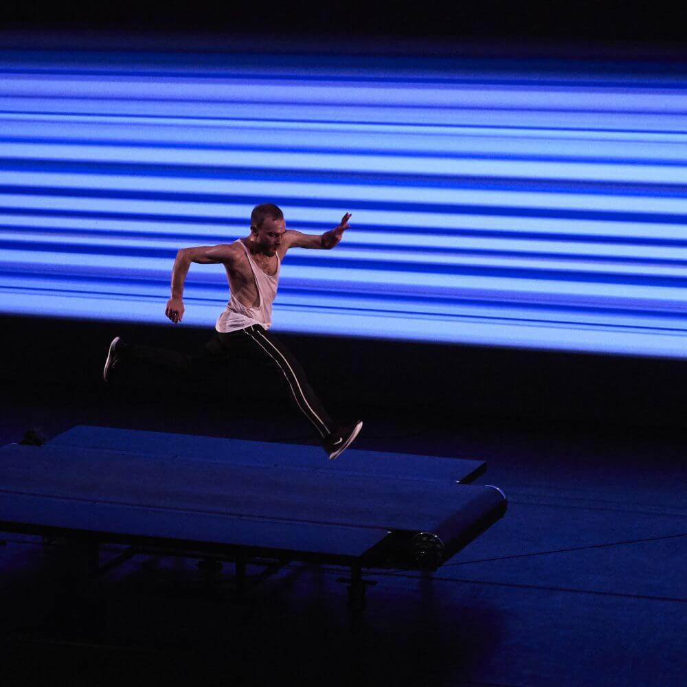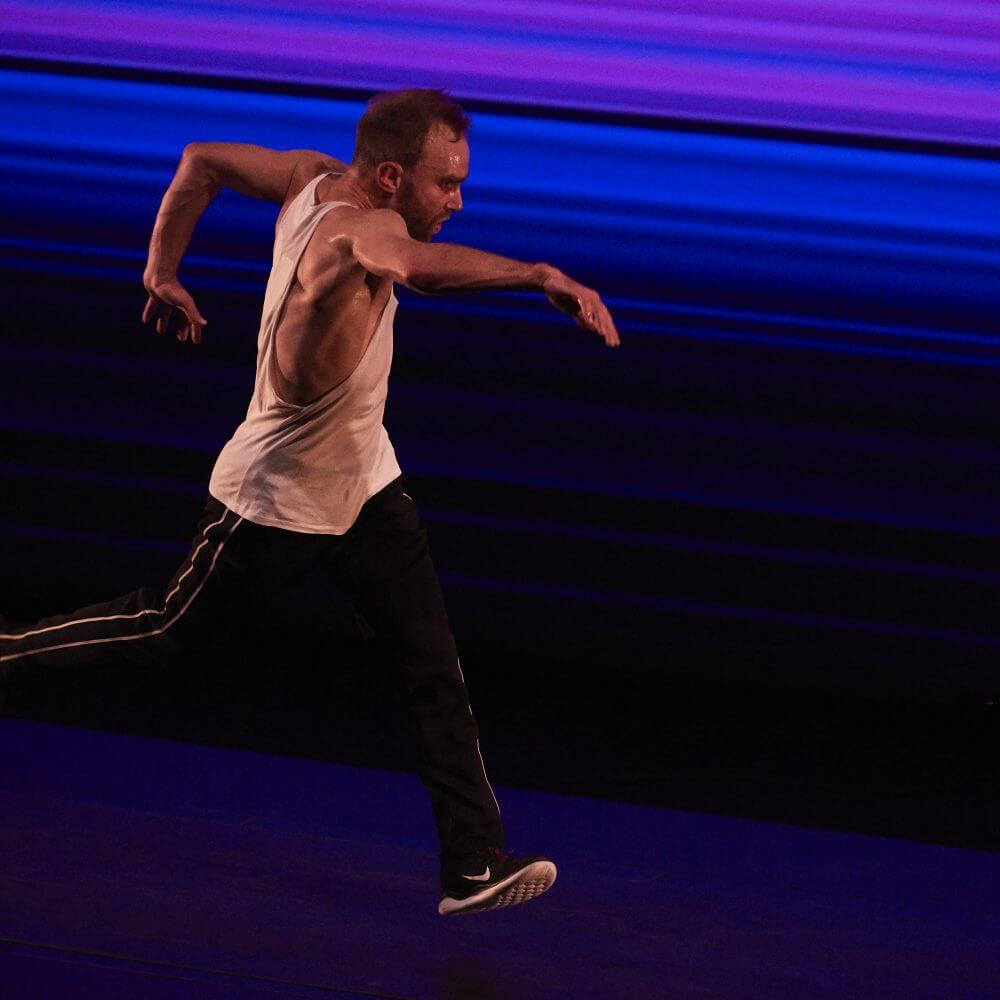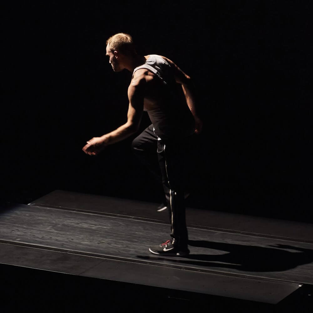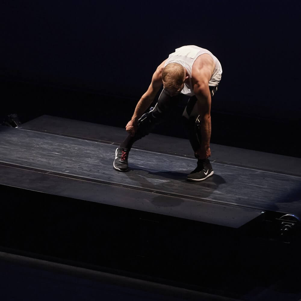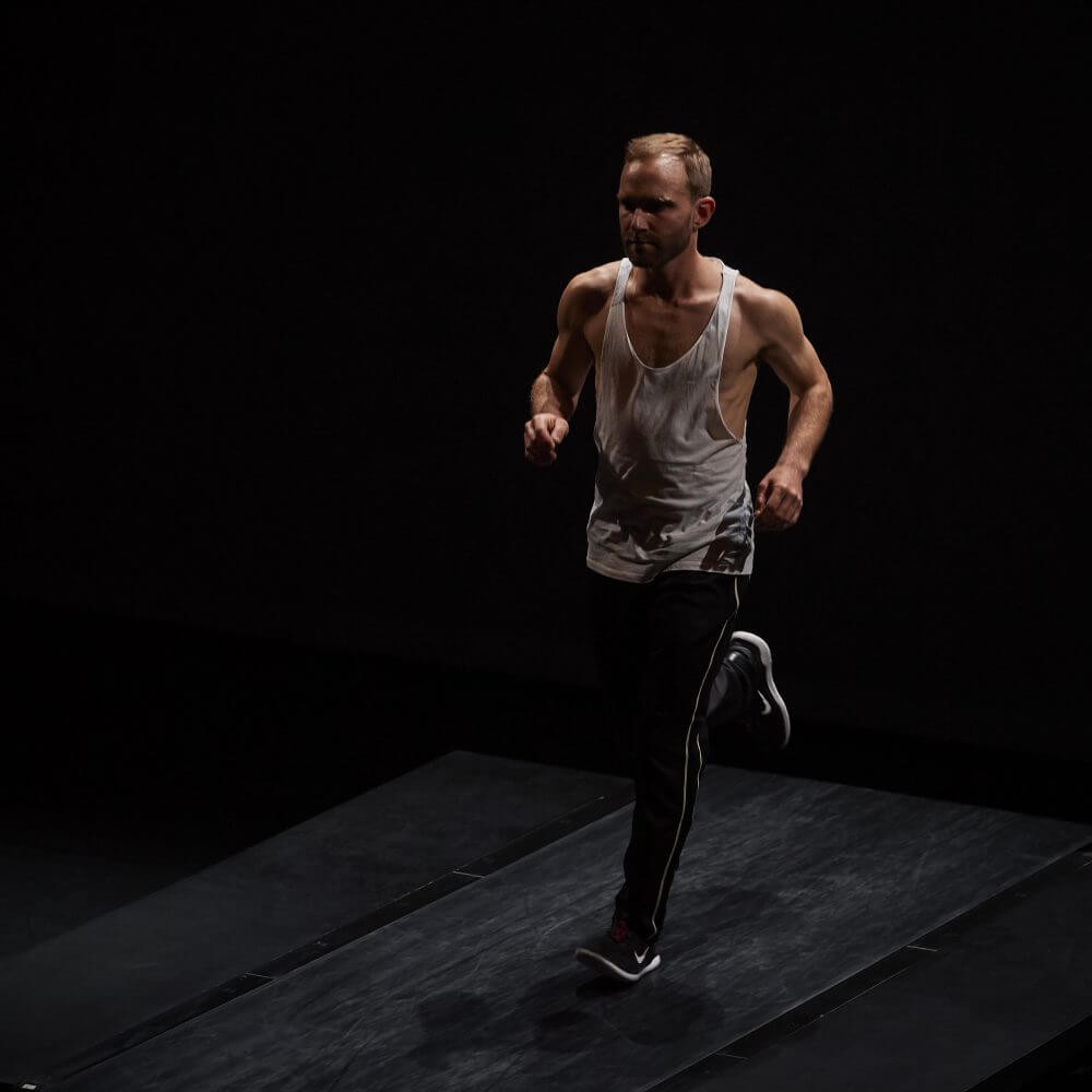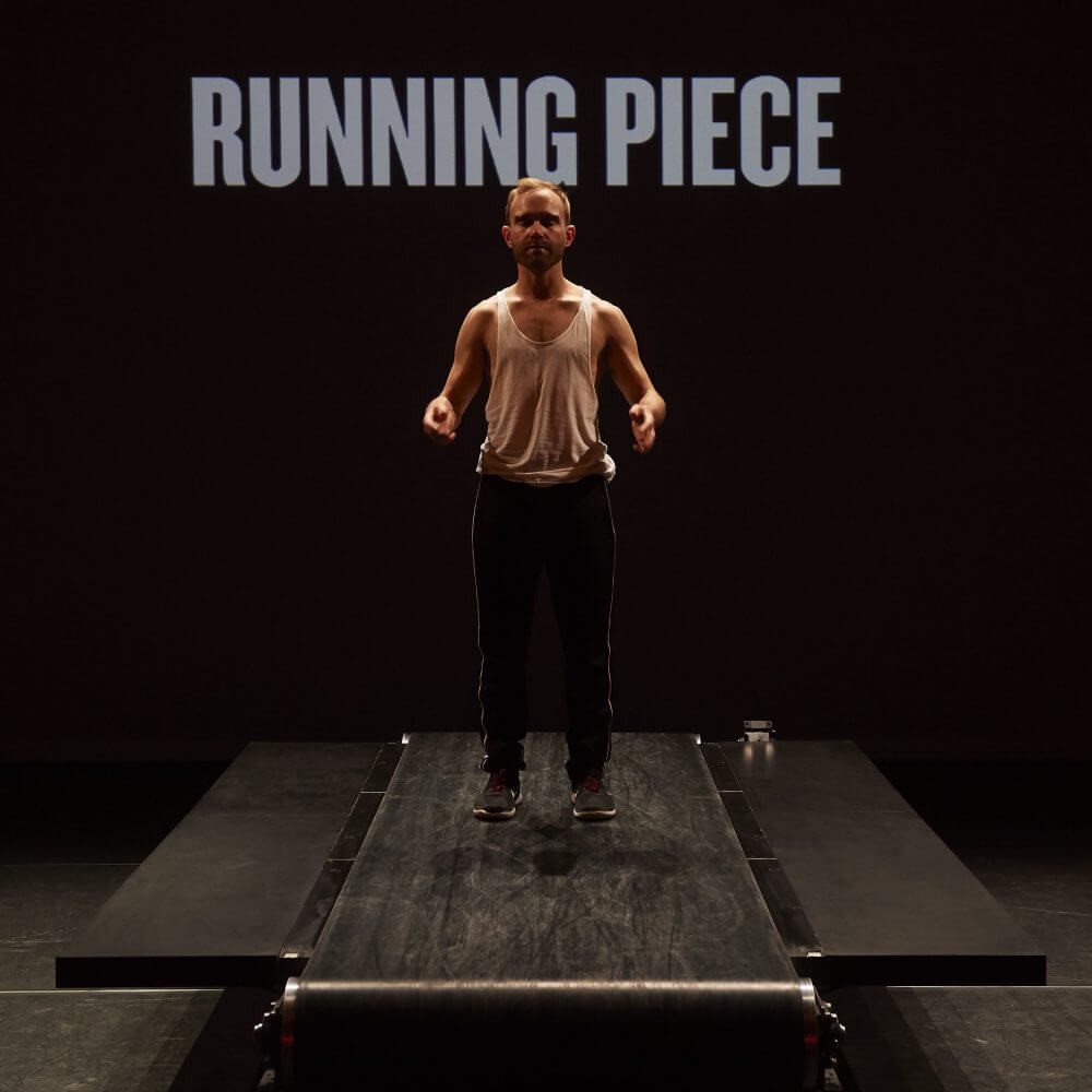 Correre può essere una metafora della vita stessa, di questo parla questa coreografia poetica, atletica, ritmica e filosofica. In un’ora di intensa performance vengono rappresentate le diverse fasi della vita e la paura della fine, che in questo caso significherebbe fermarsi e rischiare di cadere dal nastro. Running Piece mostra quanto sia facile restare nei binari già tracciati. Ma basta solo un cambio di direzione o di prospettiva e la fiducia nella nostra capacità creativa per dare alla vita un nuovo impulso.