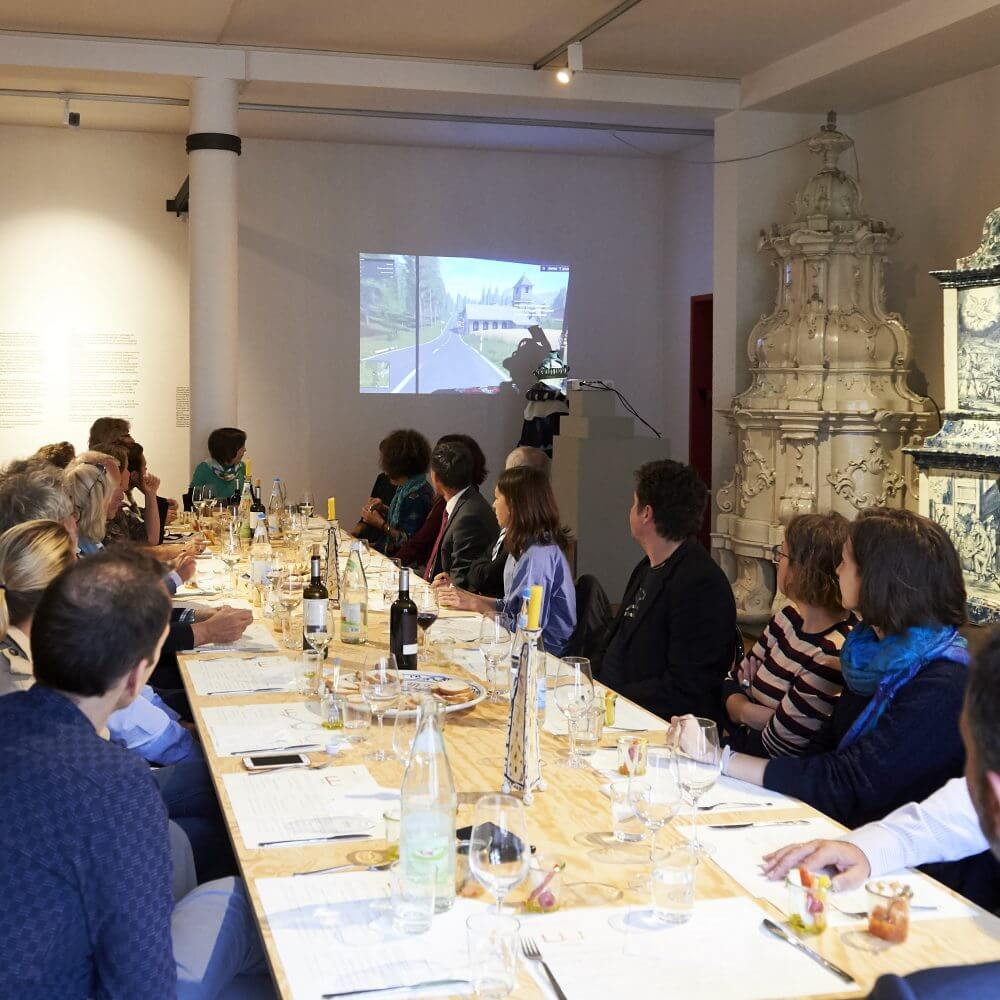 Gemeinsam mit Förstern, Berg-und Talbauern, Soziolog*innen, Wissenschaftler*innen und anderen lokalen Akteuren entwirft die Künstlergruppe INLAND, gegründet von Fernando Garcìa-Dory, ein spekulatives fiktives Zukunftsszenario für Südtirol, welches in Form eines Videos und einer räumlichen Installation im Stadtmuseum Bozen zu sehen ist. Unter den Schlüsselbegriffen Alpensee, Ur- Ur Bewohner oder „zurück zur Alm“, werden landschaftliche, kulturelle, wirtschaftliche und touristische Aspekte ausgelotet und Tendenzen weitergedacht. Das „Mittagessen“, welches an drei Dienstagen stattfindet, aktiviert Szenarien des Projektes performativ – in Küche, Kleid, Sprache und Gestik.