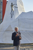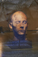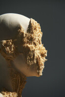 Das aufragende Profil des aus Göflaner Marmor gehauenen Berges, dessen kristalline Dichte für reines Weiß und Festigkeit steht, wird in einer seiner Ansichten mit einer fast senkrechten Wand unterbrochen, auf der eine menschliche Figur freigelegt ist. Die überlebensgroße Silhouette des Körpers durchbricht gänzlich den Berg und erinnert in Haltung und Form an den Fund des Mannes im Eis. Er überdauerte die Jahrtausende bis das abschmelzende Eis ihn an unsere Gegenwart frei gab. Der Südtiroler Bildhauer Aron Demetz wurde vom Kunstmäzen und Sammler Heinrich Gasser eingeladen, diesen Zeitzeugenmoment in eine Skulptur zu fassen, der aus Südtirol nicht mehr wegzudenken ist und selbst zur Ikone seiner Historie wurde. In seiner bildhauerischen Praxis befragt Demetz die Intimität seiner verwendeten Materialien. Dem Stein, dem Holz, selbst dem verwendete Gussmaterial legt er ein sinnbildliches Weiterwachsen nahe. Sei es, dass Harz aus den Öffnungen fließt, er das Holz zu einem weichen Flaum formt, der die Konturen des Körpers umspielen lässt oder zarte Rosenranken sich mit dem Schamottgemisch des Bronzeguss verbinden. Umso eindringlicher wird die architektonische Repräsentation des Marmors zum schmelzenden Eis und der Körper zur überdauernden Geschichte, die sich gleich seiner Jahrtausende überdauernden Verborgenheit unwiderruflich aus dem Marmor stanzt. So wird die Skulptur zum Symbol des Fortlebens des Menschen, dem aber auch eingerechnet ist, entsprechend dem Marmor, zu diesem ephemeren Moment der Vergänglichkeit wieder zurück zu kehren. So ist es auch nicht wichtig, den Namen zu nennen, den ihm sein Fundort gab. (Karin Pernegger)