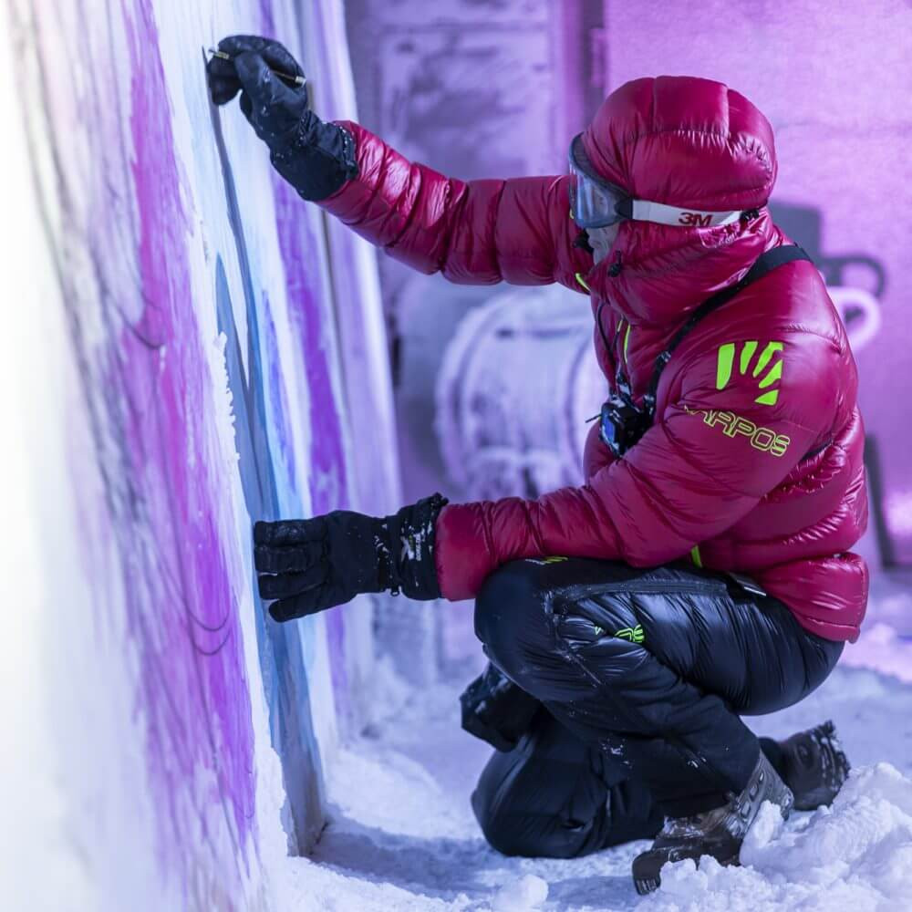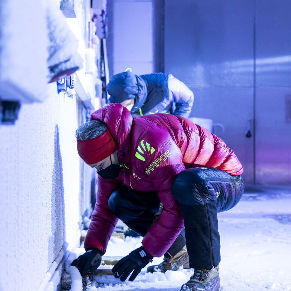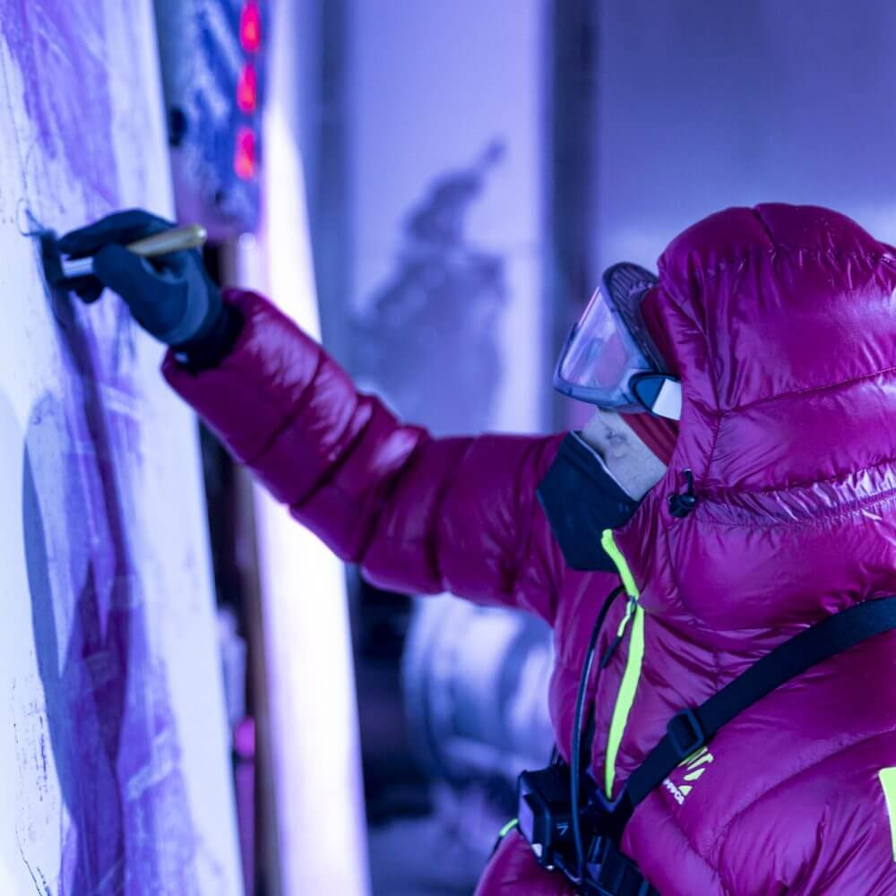 È possibile creare arte in condizioni avverse alla sopravvivenza stessa dell’uomo? Per due giorni terraXcube, il centro per la simulazione di climi estremi di Eurac Research, si trasforma nell'atelier dell’artista Peter Senoner. A una temperatura di oltre -10°C, nel bel mezzo di una tempesta di neve artificialmente prodotta e ad un’altitudine simulata di oltre 4000 metri, lavorare ad una scultura a grandezza naturale diventa una vera e propria prova di forza. Costantemente monitorati dal punto di vista medico, anche i parametri vitali – come la frequenza cardiaca e respiratoria e la saturazione dell’ossigeno – diventano a loro volta punto di partenza per disegni di grande formato creati dall'artista.