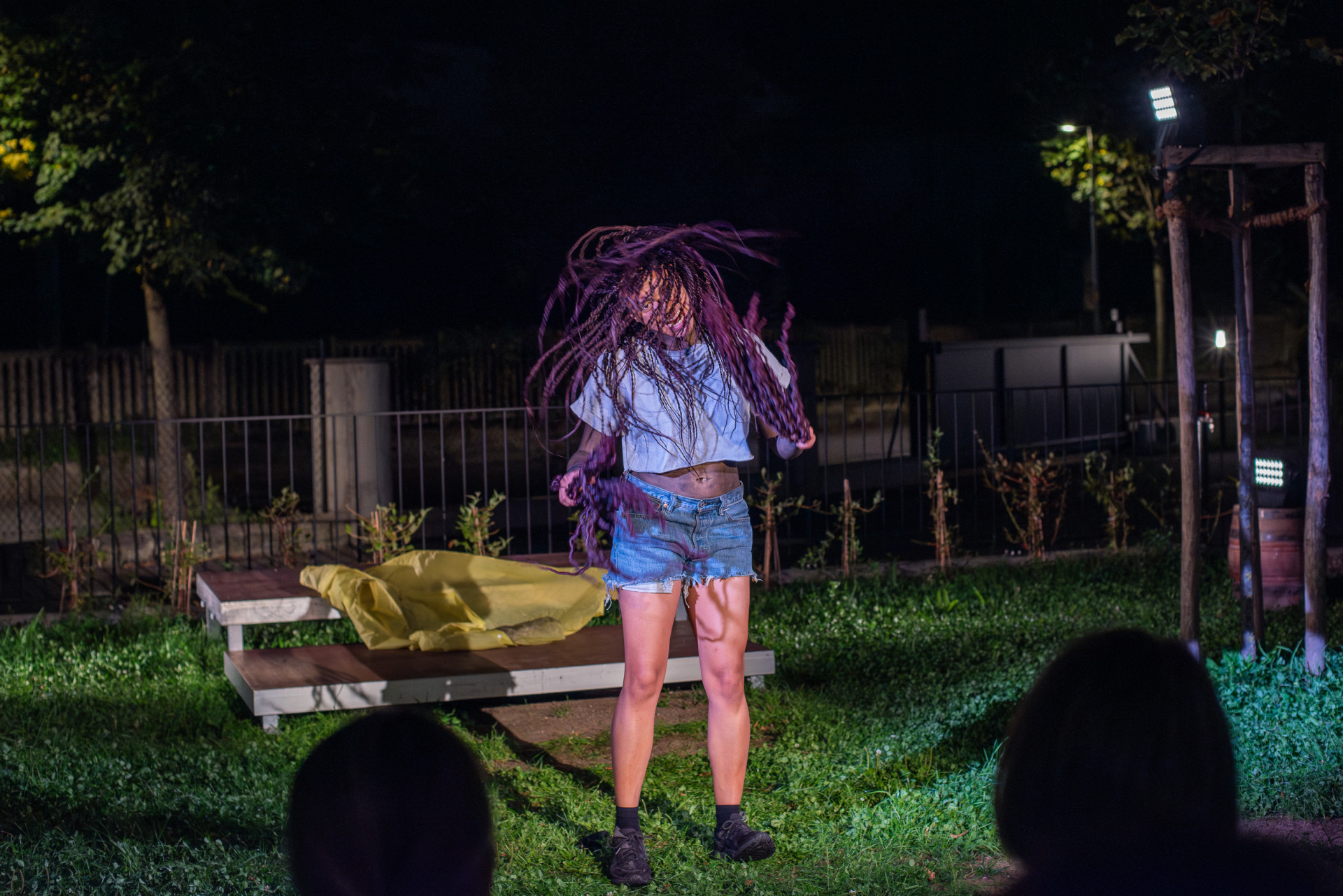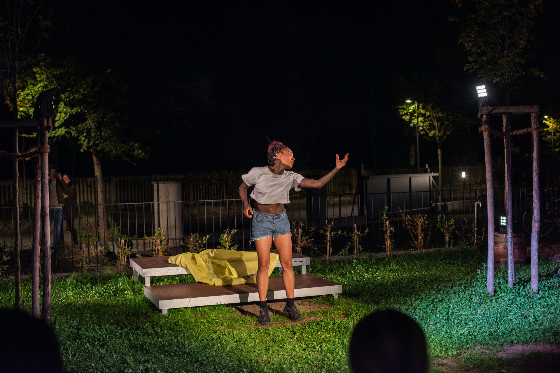 Questo assolo di danza si sviluppa intorno alla figura mitologica di Mami Wata, una dea dell’acqua il cui mito nasce in Bénin, Camerun, Congo, Brasile e Cuba e incarna le ambivalenze della storia coloniale. Figura del desiderio e della mostruosità, un "altro" che affascina e che tipicamente rifiutiamo. Betty Tchomanga la incontra, la incarna e fa emergere dalle acque più profonde una serie di volti.